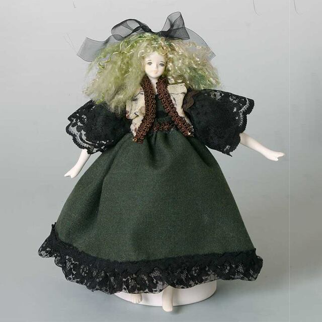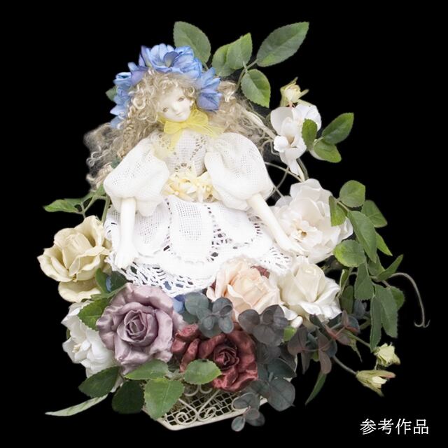【制作】少女のような穏やかな顔をした丸顔の人気定番ボディを使用し、ヘア、両腕、両足パーツは、作り付け、ドレスは、不要になったハンカチや衣類を再利用して制作します。